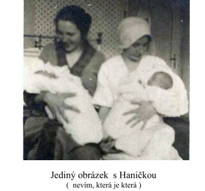 Porod byl velmi těžký (máma měla božec - eklampsii). Byly jsme nedonošené, sedmiměsíční. Já jsem vážila jen 1,60 kg, Hanička snad 1,90 kg. Byla sice silnější, ale měla špatně vyvinuté plíce. Narodila se druhá a tak byla drobátko přidušená a museli ji křísit. A jak tak nezačala hned řvát, tak se jí ty plíce nerozvinuly celé, ale jenom půl. Zemřela 27. ledna 1926. Já jsem zase byla zmačknutá od kleští, jak mě tahali. Měla jsem ochrnutou pravou tvář a musela jsem ještě dlouho chodit na elektrické masáže. Trochu se to zlepšilo, ale ne dočista.