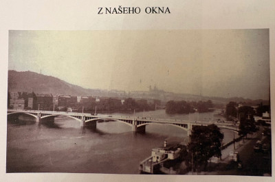 Dědeček s babičkou uvolnili svoji ložnici (pokoj do dvora) Olze s Jirkou a nastěhovali se do malého pokoje na nábřeží. Ela, která prakticky nebyla doma, ale u Anduly Sedláčkové, si vzala pokojíček pro služku (služka vždycky spala v kuchyni na posteli, kterou jsem už popsala hned na začátku). Prostřední pokoj do nábřeží byla jídelna s velkým oválným stolem uprostřed, kde byl taky psací stůl, kanape a dědečkův báječně pohodlný ušák, který jsem později neomluvitelně vyhodila jen proto, že měl potrhané popruhy (tenkrát jsem ještě neuměla čalounit kanapata) - tedy spíš něco jako obývák. A velký pokoj na kraji byl Mánin, ale byl to vlastně salon, zařízený starožitnostmi, kde se konaly všechny rodinné společenské záležitosti. Máňa tam měla složitě maskovanou skládací postel, jejíž systém nedovedu popsat. Složené to vypadalo jako komoda se čtyřmi zásuvkami. Když se to rozložilo byla to postel s čelem u zdi.